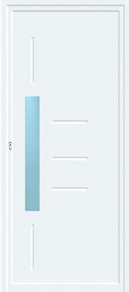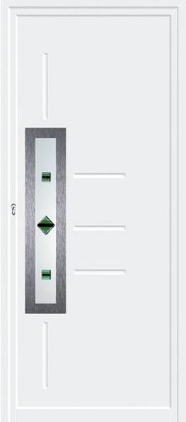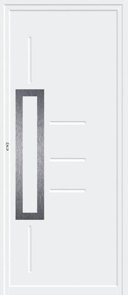 Painel de porta composto por 2 chapas de alumínio termolacado e poliuretano injetado, formando uma estrutura estratificada (sanduíche) com espessura standard de 24mm.