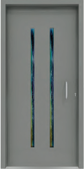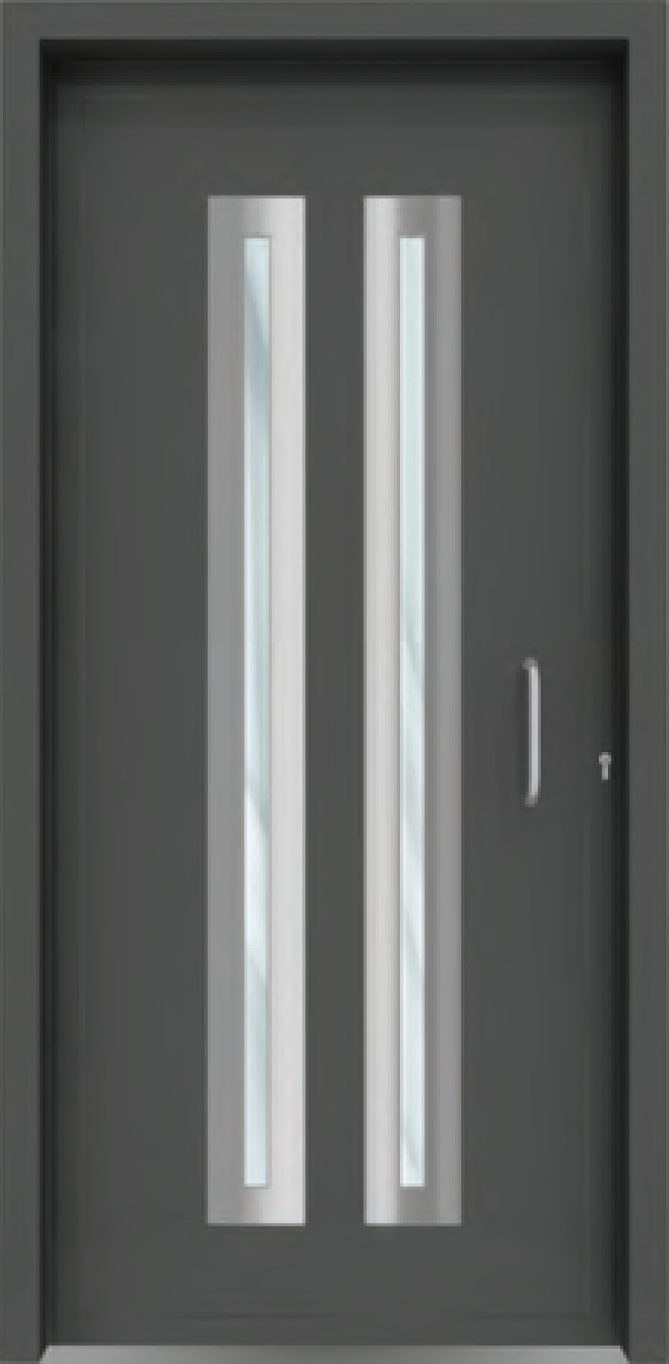 Painel de porta composto por 2 chapas de alumínio termolacado e poliuretano injetado, formando uma estrutura estratificada (sanduíche) com espessura standard de 24mm.