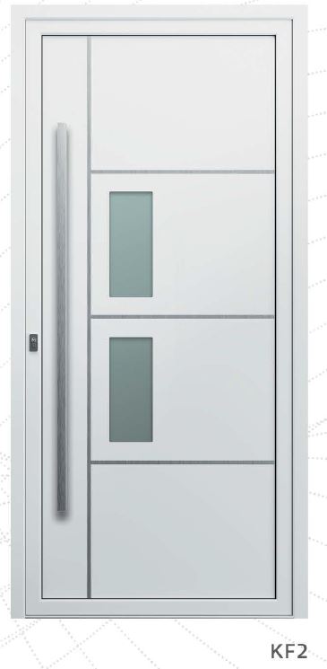 Painel de porta composto por 2 chapas de alumínio de 2,5mm de espessura com poliuretano injetado entre ambas, à densidade de 120kg/m3, com ou sem vidro.