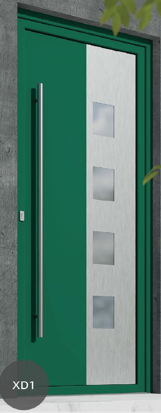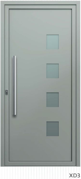 ​​​​​​Painel de porta composto por 2 chapas de alumínio de 2,5mm de espessura com poliuretano injetado entre ambas, à densidade de 120kg/m3, com ou sem vidro.