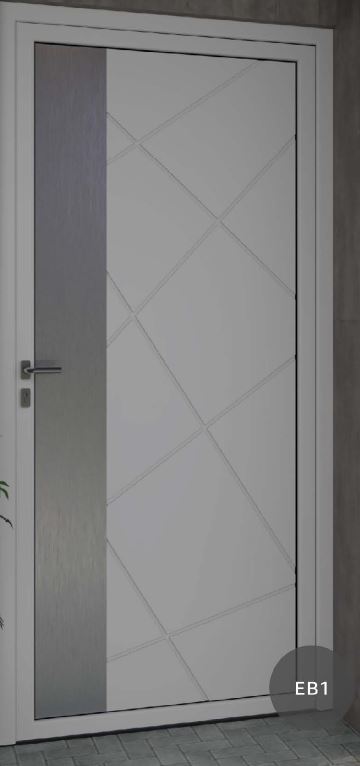 Painel de porta composto por 2 chapas de alumínio de 2,5mm de espessura com poliuretano injetado entre ambas, à densidade de 120kg/m3, com ou sem vidro.