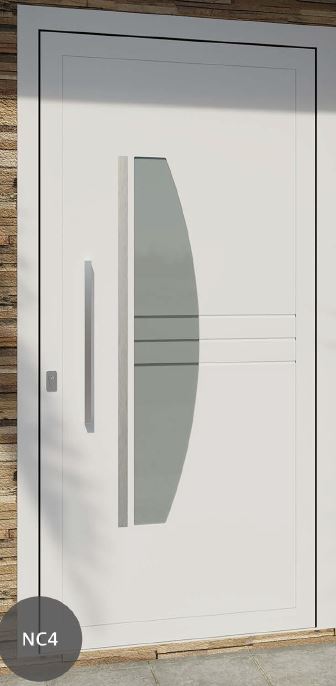 Painel de porta composto por 2 chapas de alumínio de 2,5mm de espessura com poliuretano injetado entre ambas, à densidade de 120kg/m3, com ou sem vidro.