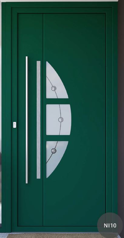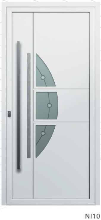 Painel de porta composto por 2 chapas de alumínio de 2,5mm de espessura com poliuretano injetado entre ambas, à densidade de 120kg/m3, com ou sem vidro.