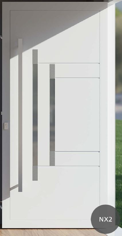 Painel de porta composto por 2 chapas de alumínio de 2,5mm de espessura com poliuretano injetado entre ambas, à densidade de 120kg/m3, com ou sem vidro.