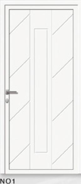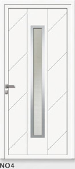 Painel de porta composto por 2 chapas de alumínio de 2,5mm de espessura com poliuretano injetado entre ambas, à densidade de 120kg/m3, com ou sem vidro.