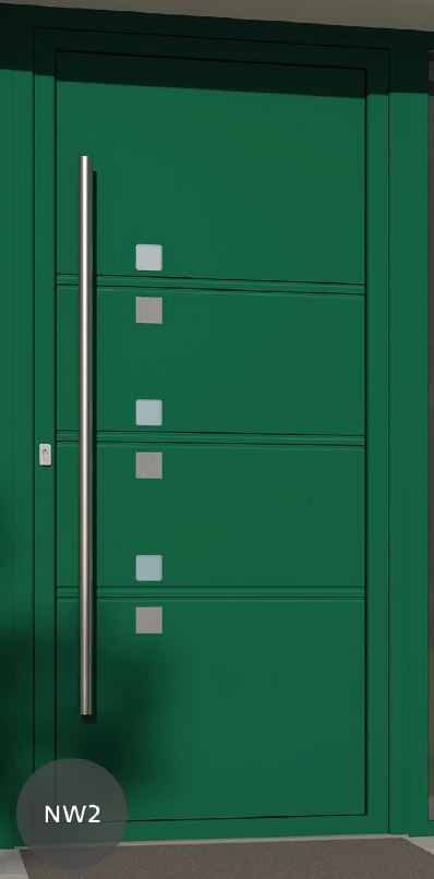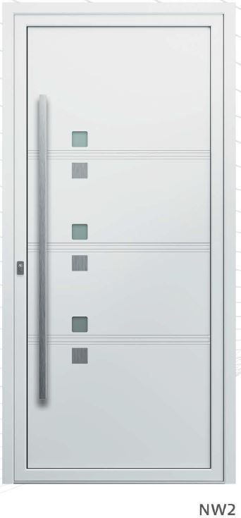 ​​​​​​Painel de porta composto por 2 chapas de alumínio de 2,5mm de espessura com poliuretano injetado entre ambas, à densidade de 120kg/m3, com ou sem vidro.