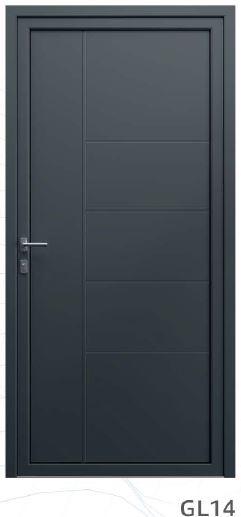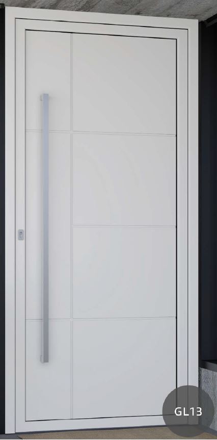 ​​​​​​Painel de porta composto por 2 chapas de alumínio de 2,5mm de espessura com poliuretano injetado entre ambas, à densidade de 120kg/m3, com ou sem vidro.