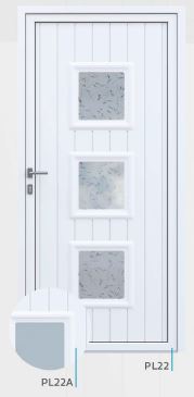 Painel de porta composto por 2 chapas de alumínio de 1,8mm de espessura com poliuretano injetado entre ambas, à densidade de 120kg/m3, com ou sem vidro.