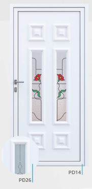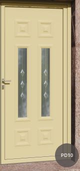 Painel de porta composto por 2 chapas de alumínio de 1,8mm de espessura com poliuretano injetado entre ambas, à densidade de 120kg/m3, com ou sem vidro.
