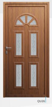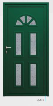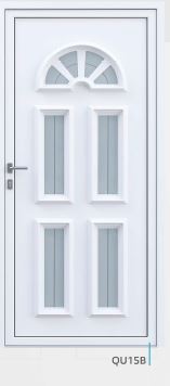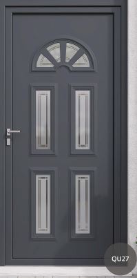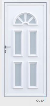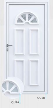 Painel de porta composto por 2 chapas de alumínio de 1,8mm de espessura com poliuretano injetado entre ambas, à densidade de 120kg/m3, com ou sem vidro.
