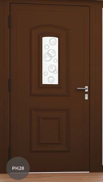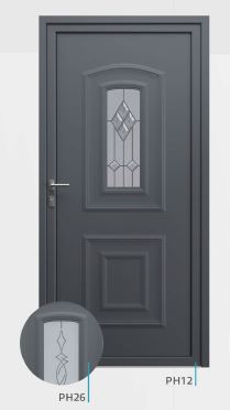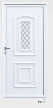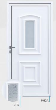Painel de porta composto por 2 chapas de alumínio de 1,8mm de espessura com poliuretano injetado entre ambas, à densidade de 120kg/m3, com ou sem vidro.