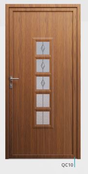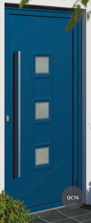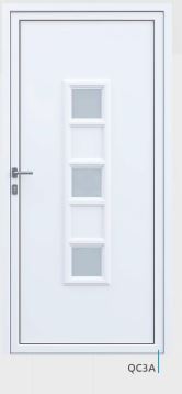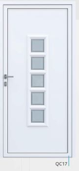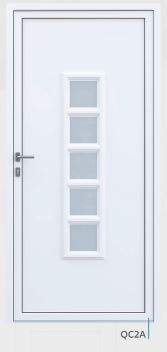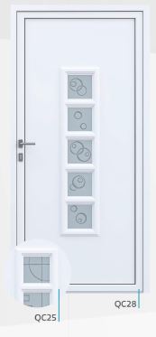 Painel de porta composto por 2 chapas de alumínio de 1,8mm de espessura com poliuretano injetado entre ambas, à densidade de 120kg/m3, com ou sem vidro.