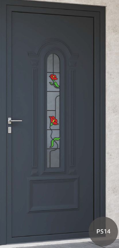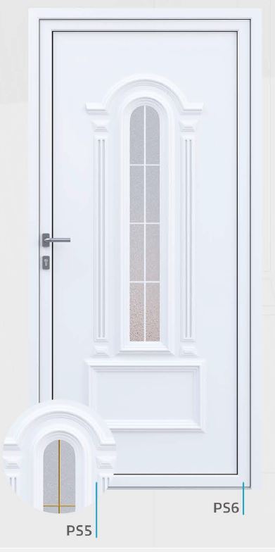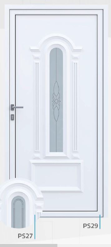 Painel de porta composto por 2 chapas de alumínio de 1,8mm de espessura com poliuretano injetado entre ambas, à densidade de 120kg/m3, com ou sem vidro.