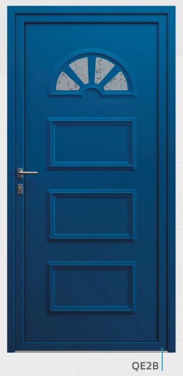 Painel de porta composto por 2 chapas de alumínio de 1,8mm de espessura com poliuretano injetado entre ambas, à densidade de 120kg/m3, com ou sem vidro.