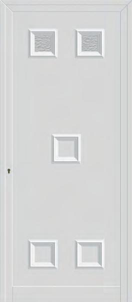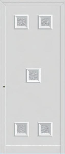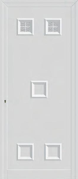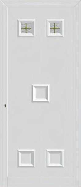 Painel de porta composto por 2 chapas de alumínio termolacado e poliuretano injetado, formando uma estrutura estratificada (sanduíche) com espessura standard de 20mm.