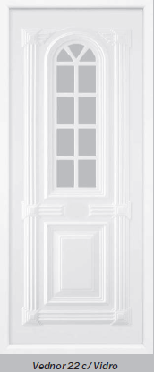 Painel de porta composto por 2 chapas de alumínio de 1,8mm de espessura, com enchimento por injecção de poliuretano de alta densidade.