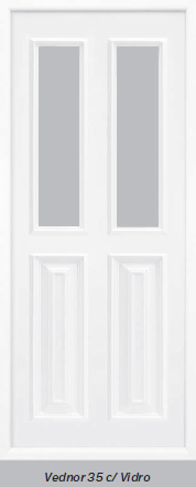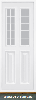 Painel de porta composto por 2 chapas de alumínio de 1,8mm de espessura, com enchimento por injecção de poliuretano de alta densidade.