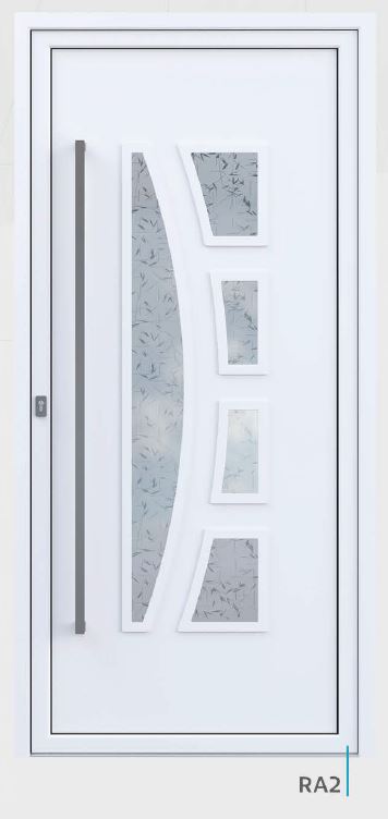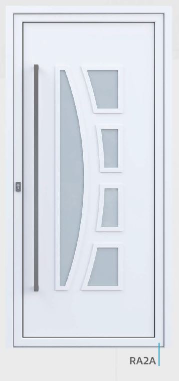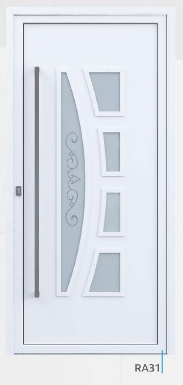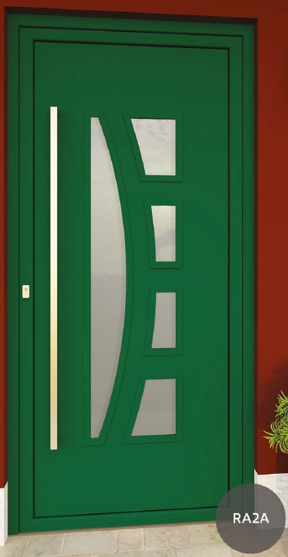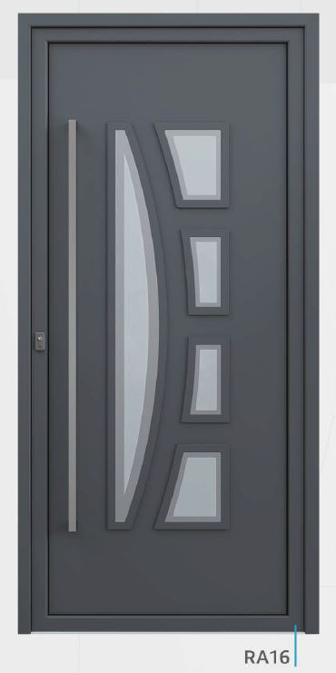 Painel de porta composto por 2 chapas de alumínio de 1,8mm de espessura com poliuretano injetado entre ambas, à densidade de 120kg/m3, com ou sem vidro.