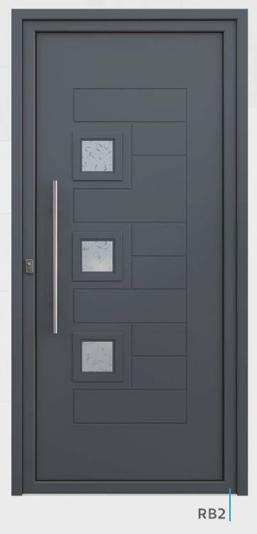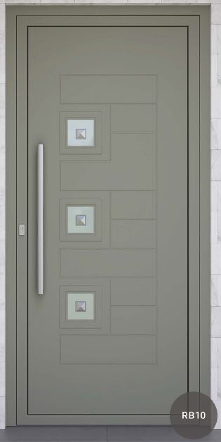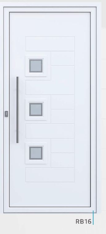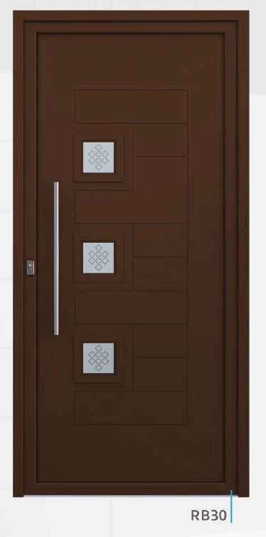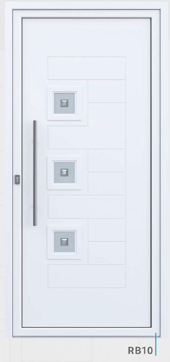 Painel de porta composto por 2 chapas de alumínio de 1,8mm de espessura com poliuretano injetado entre ambas, à densidade de 120kg/m3, com ou sem vidro.
