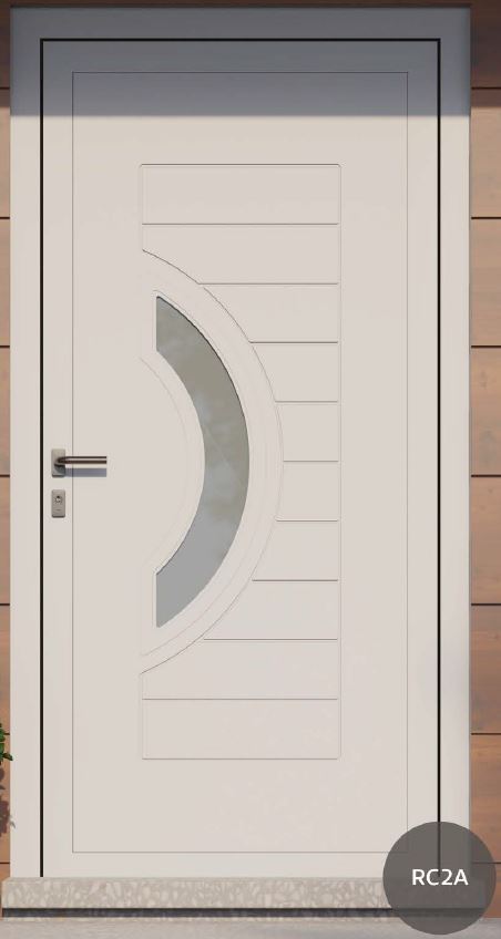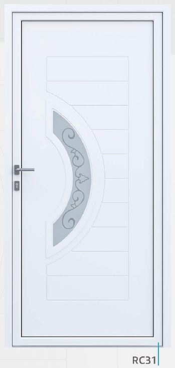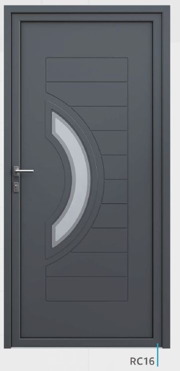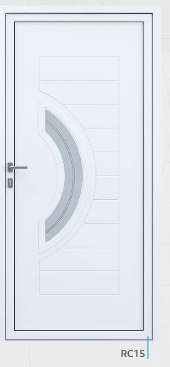 Painel de porta composto por 2 chapas de alumínio de 1,8mm de espessura com poliuretano injetado entre ambas, à densidade de 120kg/m3, com ou sem vidro.
