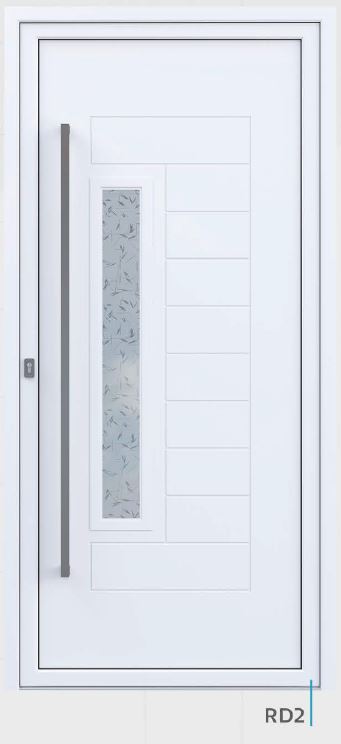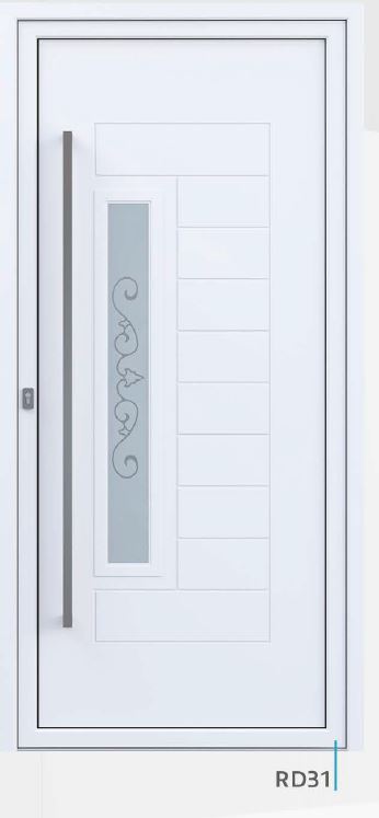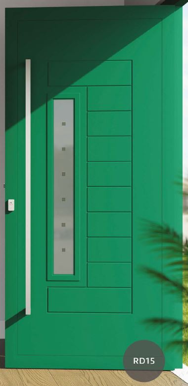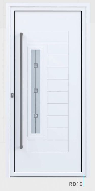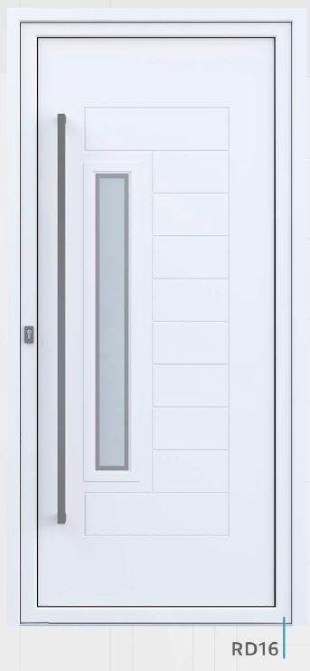 Painel de porta composto por 2 chapas de alumínio de 1,8mm de espessura com poliuretano injetado entre ambas, à densidade de 120kg/m3, com ou sem vidro.