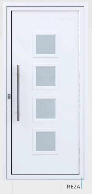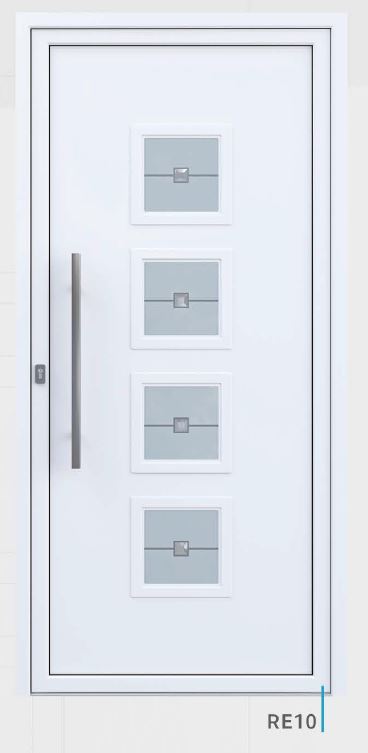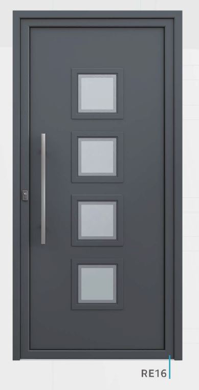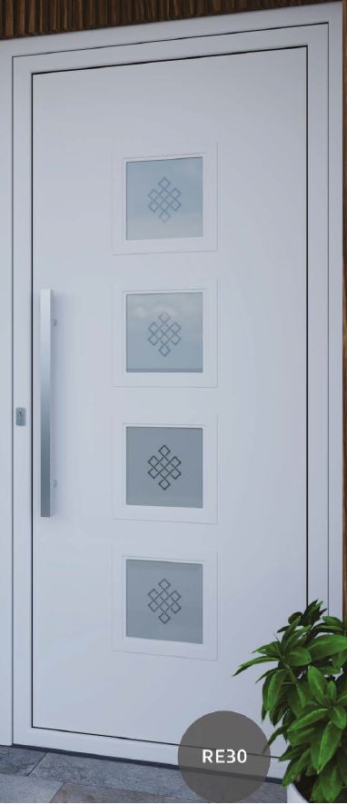 Painel de porta composto por 2 chapas de alumínio de 1,8mm de espessura com poliuretano injetado entre ambas, à densidade de 120kg/m3, com ou sem vidro.