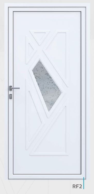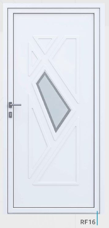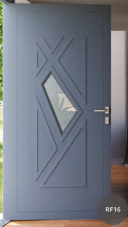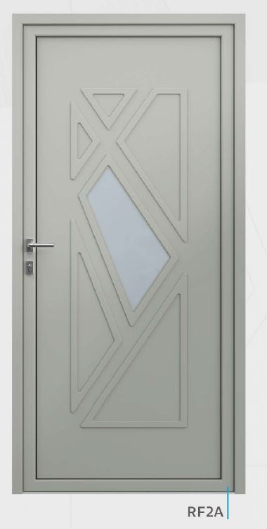 Painel de porta composto por 2 chapas de alumínio de 1,8mm de espessura com poliuretano injetado entre ambas, à densidade de 120kg/m3, com ou sem vidro.