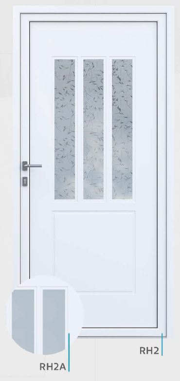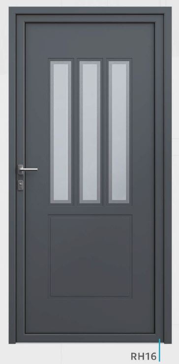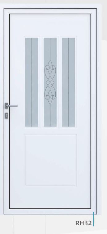 Painel de porta composto por 2 chapas de alumínio de 1,8mm de espessura com poliuretano injetado entre ambas, à densidade de 120kg/m3, com ou sem vidro.