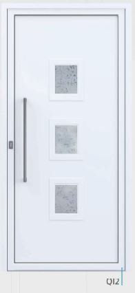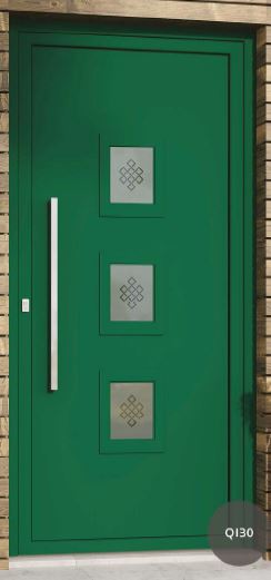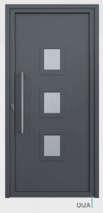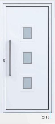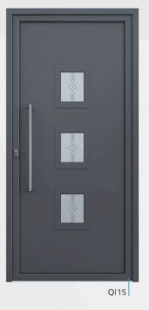 Painel de porta composto por 2 chapas de alumínio de 1,8mm de espessura com poliuretano injetado entre ambas, à densidade de 120kg/m3, com ou sem vidro.