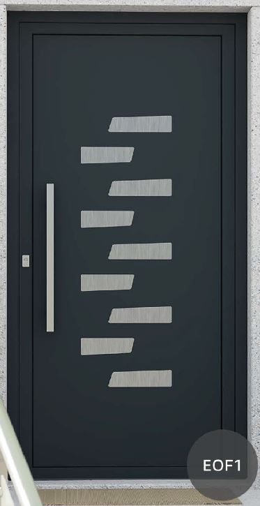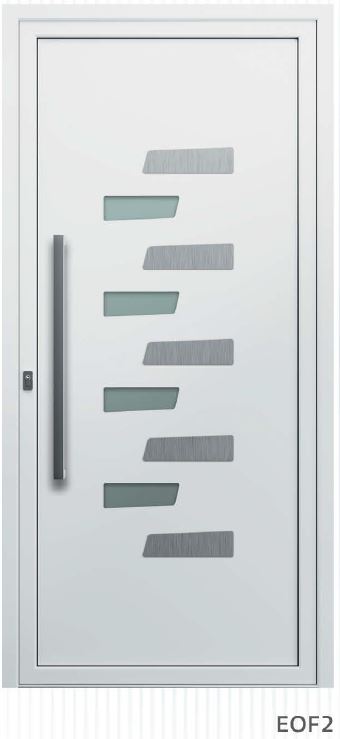 ​​​​​​Painel de porta composto por 2 chapas de alumínio de 2,5mm de espessura com poliuretano injetado entre ambas, à densidade de 120kg/m3, com ou sem vidro.