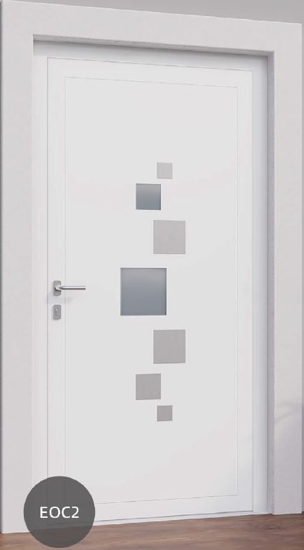 ​​​​​​Painel de porta composto por 2 chapas de alumínio de 2,5mm de espessura com poliuretano injetado entre ambas, à densidade de 120kg/m3, com ou sem vidro.